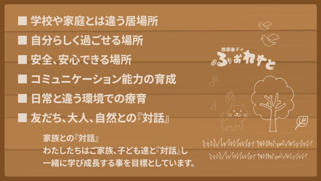 私たちについて メニュー ホーム 私たちについて お知らせ アクセス よくある質問 お問い合わせ Home About us News Access Q&A Contact メニュー ホーム 私たちについて お知らせ アクセス よくある質問 お問い合わせ 私たちについて ご挨拶 Message 沖縄県糸満市に「クオリティ・オブ・ライフ ふぉれすと 糸満校」を開校させていただくにあたり、自然豊かなこの環境で伸び伸びと楽しそうに遊ぶ子供たちの姿や、親御さんの顔に自然に笑顔が生まれるコニュニケーションの場になると感じました。私たちスタッフもこの環境を楽しみながら、子ども達と対話し一緒に学び一緒に成長する事を目標としていきます。 クオリティ・オブ・ライフ ふぉれすと 糸満校について QOL 私たちは、会話でなはく『対話』し、お互いを理解するために、話し合いをおこなって信頼関係を築くためのコミュニケーションを大切にしています。又、『対話』とは聴き合いと伝え合いの確認作業と考えています。 私たちの目指すこと Concept 『指導ポイント』 指導員は子どもと向き合い対話することを基本としています。子どもの個性や反応を踏まえ、興味を引き出し個別の療育を行います。子どもと向き合う時の接し方として、まず、子どもと目線を合わせて対話します。子どもの特性を理解したうえで、興味を引き出すまで十分に時間をかけます。子ども達は個性的でひとりひとりが違います。子ども達を一括にマニュアル化、パターン化するのはとても難しいと考えます。個別に時間をかけ対応する療育が必要と考え、ご家族と連携し子どもに合わせた療育を工夫していきます。そして子ども達の自主性を尊重しながらも、学習支援、身体を動かす運動、SST(ソーシャルスキルトレーニング)等を行い、子ども達の生きる力を伸ばしていきたいと考えています。 個々の子どもの特性・個性を熟知した療育 ※木育(もくいく)とは、子ども達が木や森に親しむきっかけとして木製玩具での遊びを体験し、その後、身近な食物などの自然観察や木を使ったものづくりへと発展する内容です。
