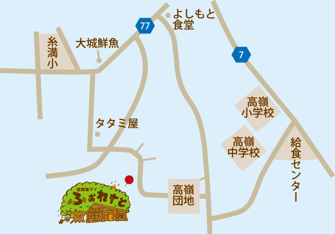 アクセス メニュー ホーム 私たちについて お知らせ アクセス よくある質問 お問い合わせ Home About us News Access Q&A Contact メニュー ホーム 私たちについて お知らせ アクセス よくある質問 お問い合わせ アクセス 糸満市大里2122番地 TEL 098-894-6038 FAX 098-894-6039 定休日 日曜日 メール forest.itoman@gmail.com 【那覇方面から】糸満ロータリーを照屋向け左折、そのまま道なりに進みます。(県道77号線)左手に糸満小学校が見えます。確認だけでOKです!糸満小学校を過ぎて2つめの信号を過ぎると、右手に『緑の広場』という小さな公園があります。その公園を右折します。そのまま道なりに進みます。細い道です。白い自動販売機のある三叉路に突き当たったら、左折しそのまま進みます。途中大きな道に出ますが、そのまま真っすぐ進みます。(まだ開通していません。)二股に分かれる道を右に進みます。50mほど進むと右手に『クオリティ・オブ・ライフ ふぉれすと 糸満校』があります!到着です。詳しくは動画でご確認ください♪